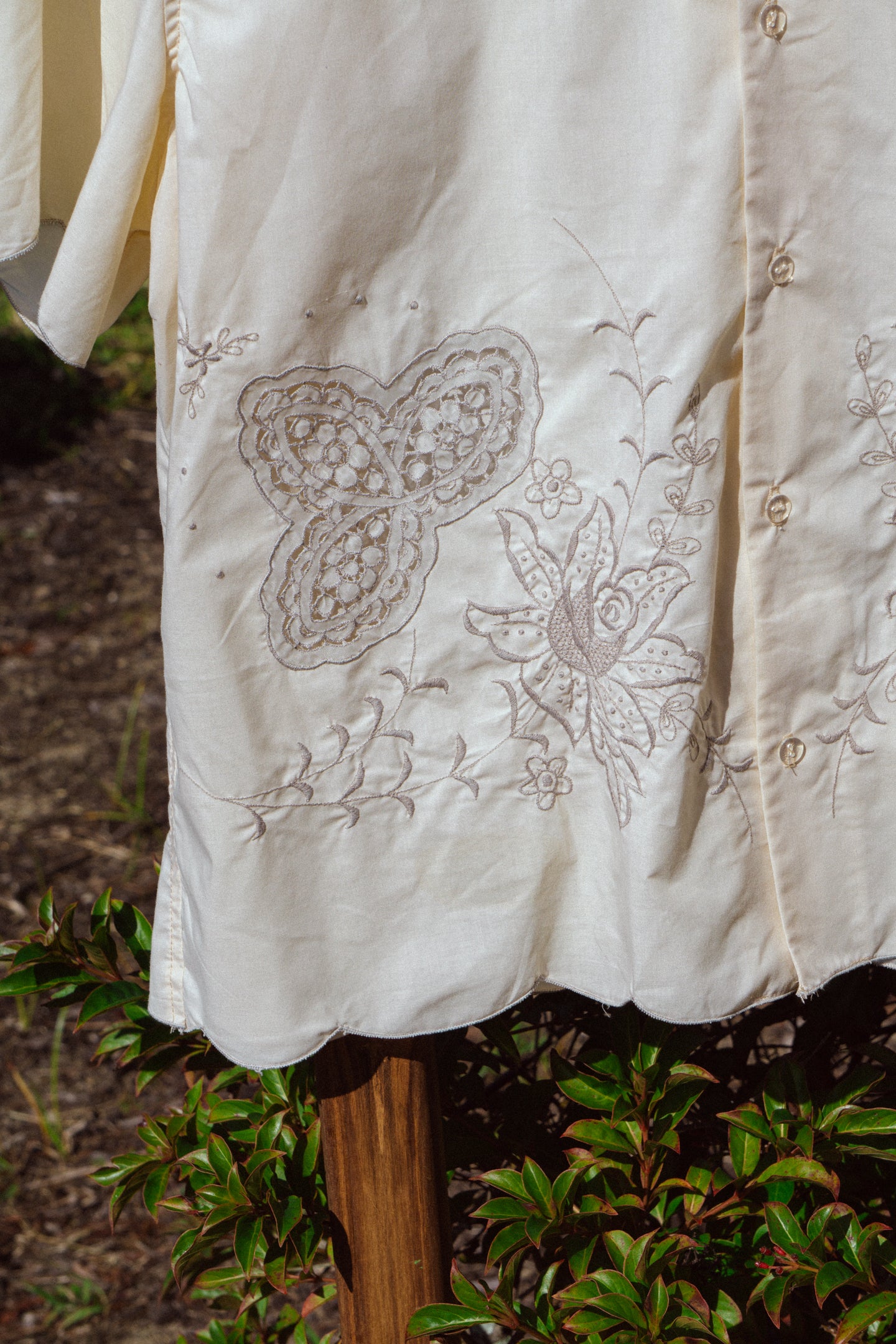 Handmade button down, made from a vintage cloth tablecloth. Lightweight with plenty of ventilation via the embroidered decorations.