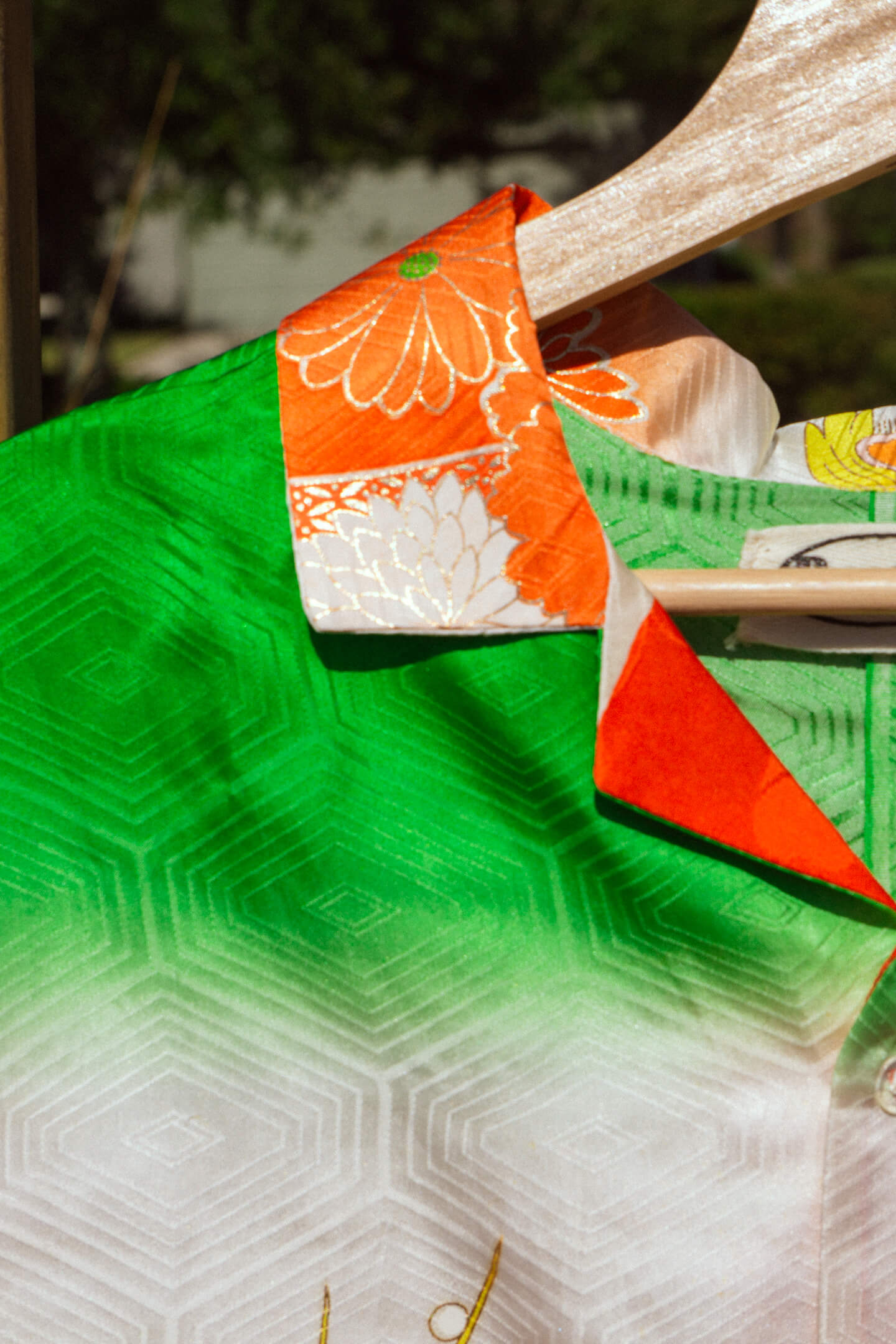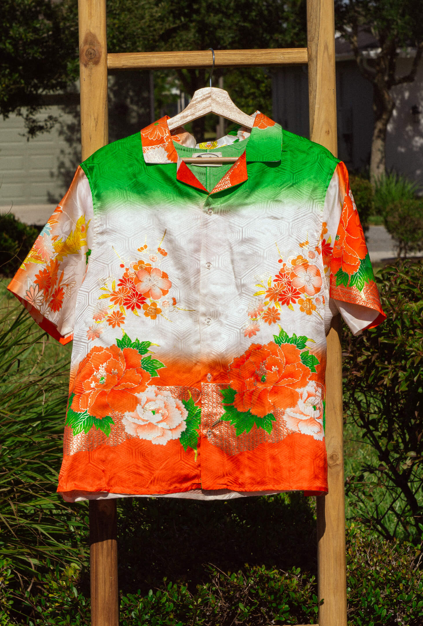 A gorgeous vintage Japanese silk kimono has been repurposed for this tie-top. Intricate gold lining and geometric patterns cover the entirety of this artful shirt.