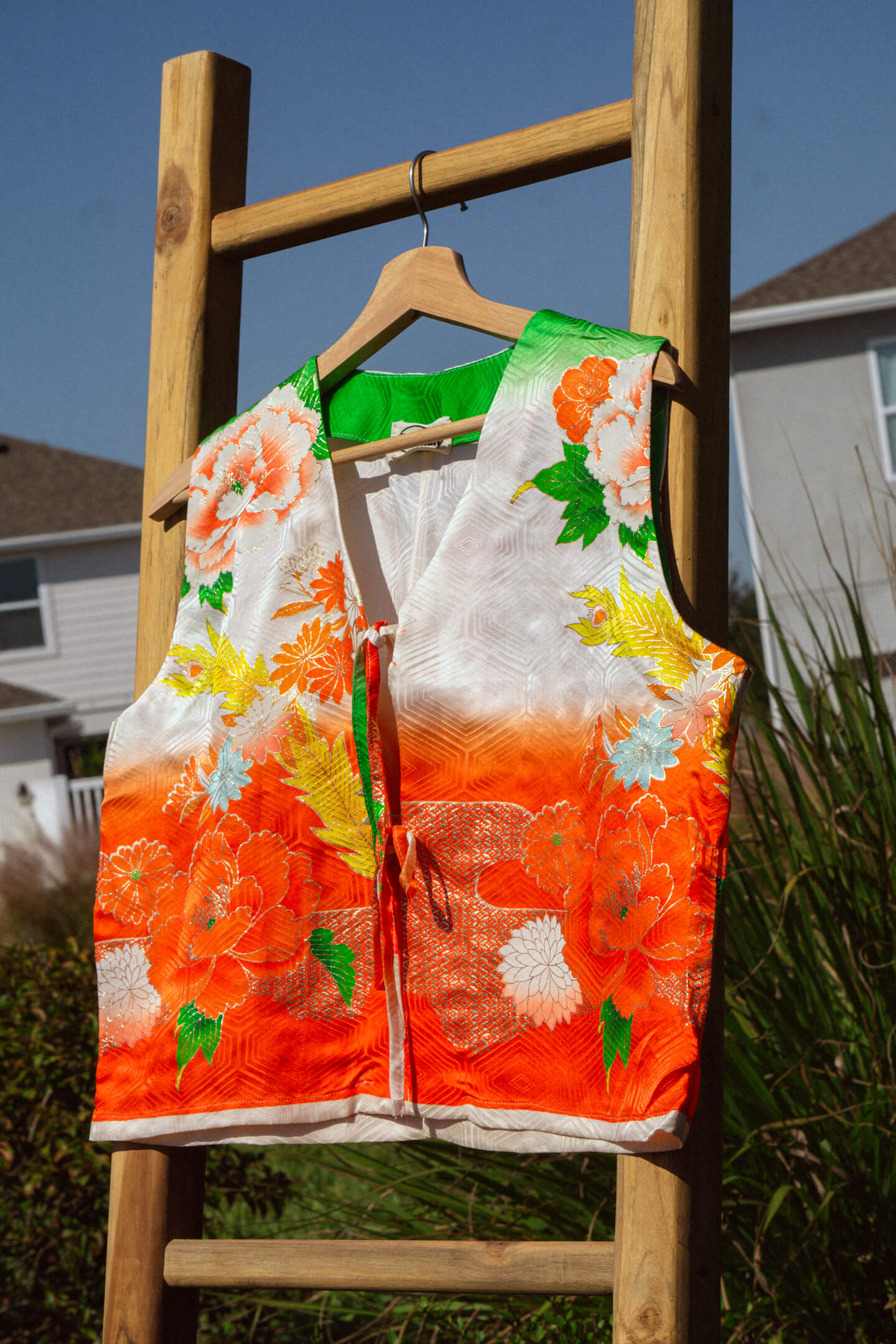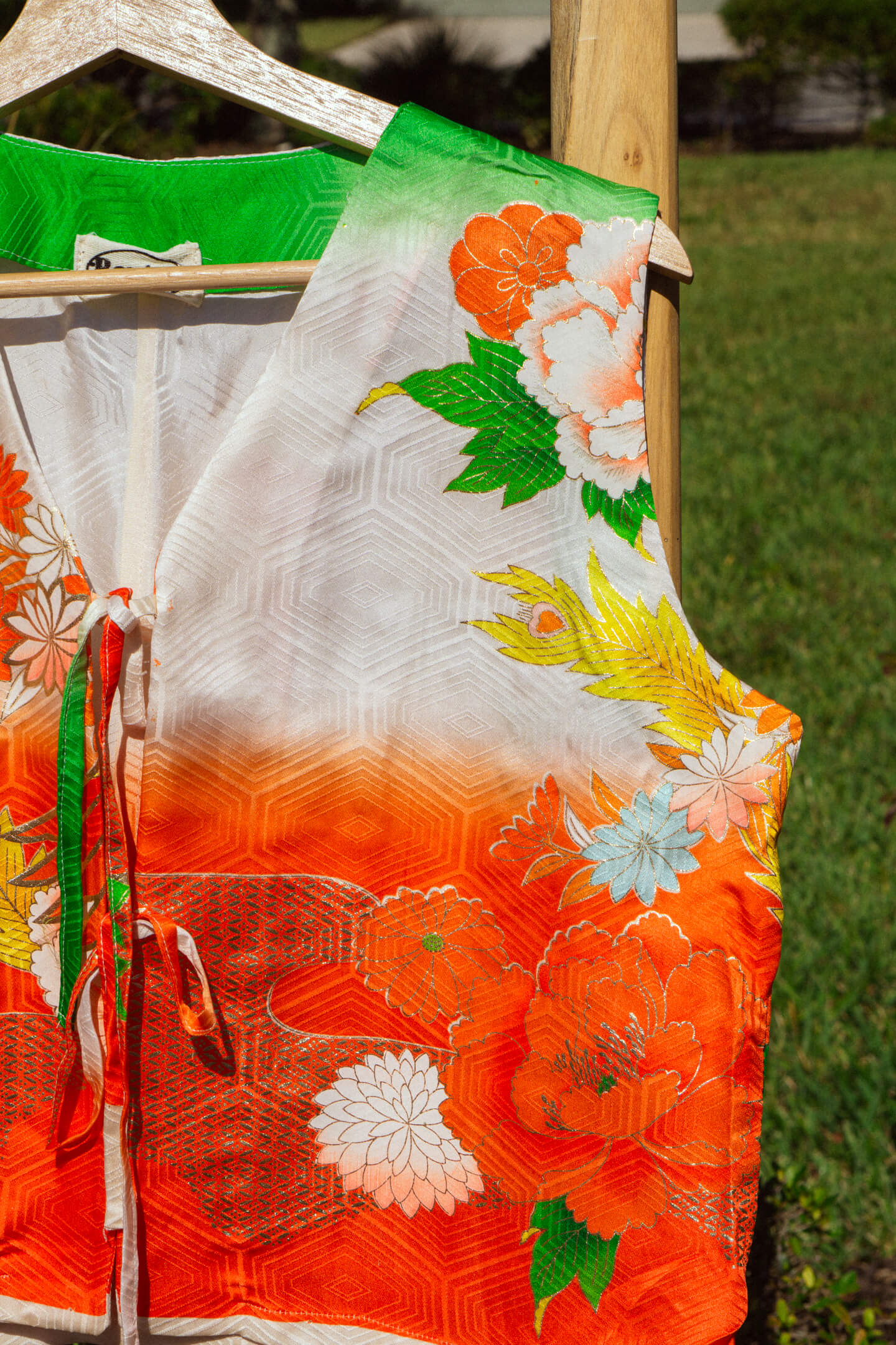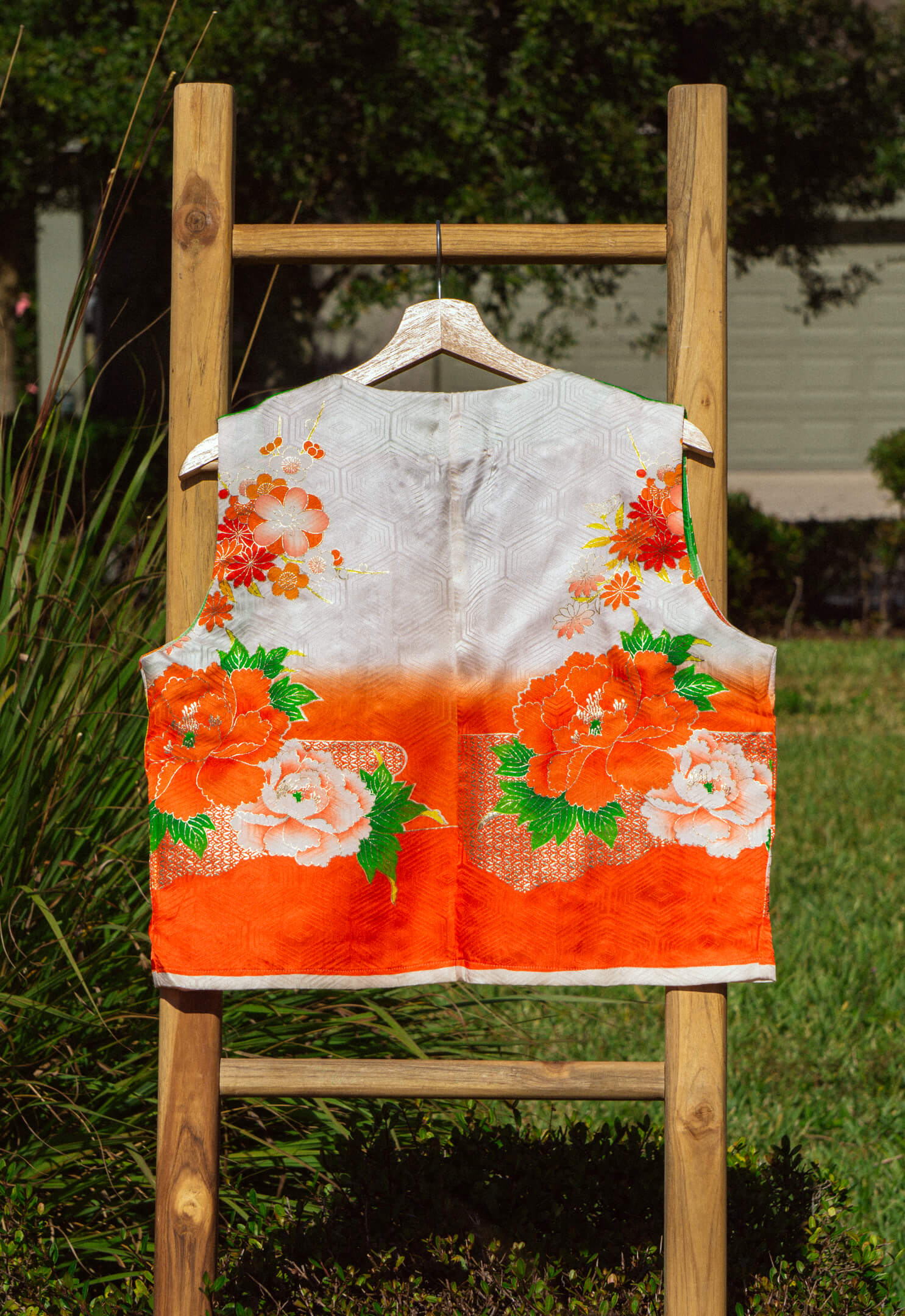 A gorgeous vintage Japanese silk kimono has been repurposed for this tie-top. Intricate gold lining and geometric patterns cover the entirety of this artful shirt.