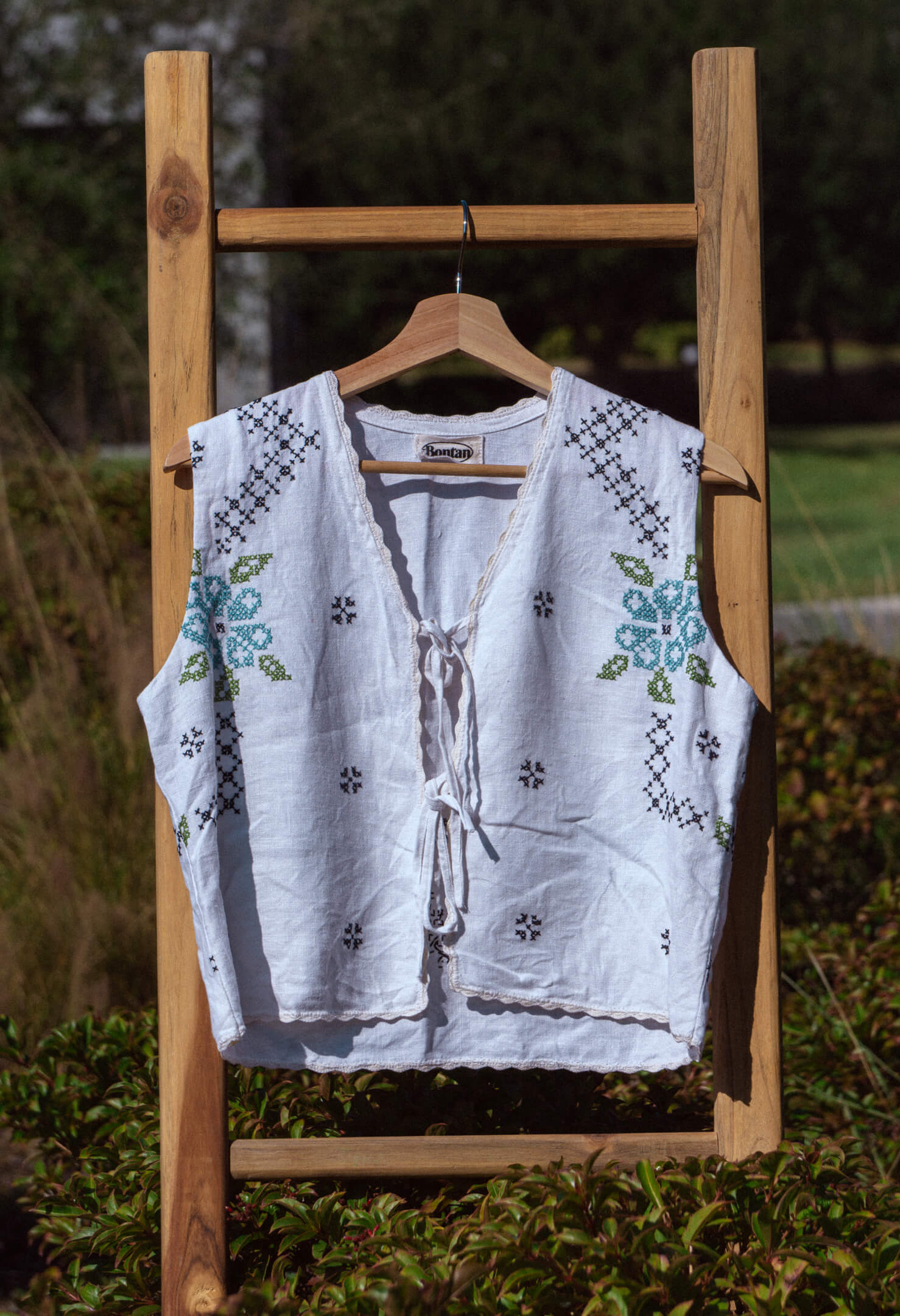 Handmade women's tie-top, made from a vintage linen tablecloth. Features carefully hand-stitched flower embroidery all over the shirt.