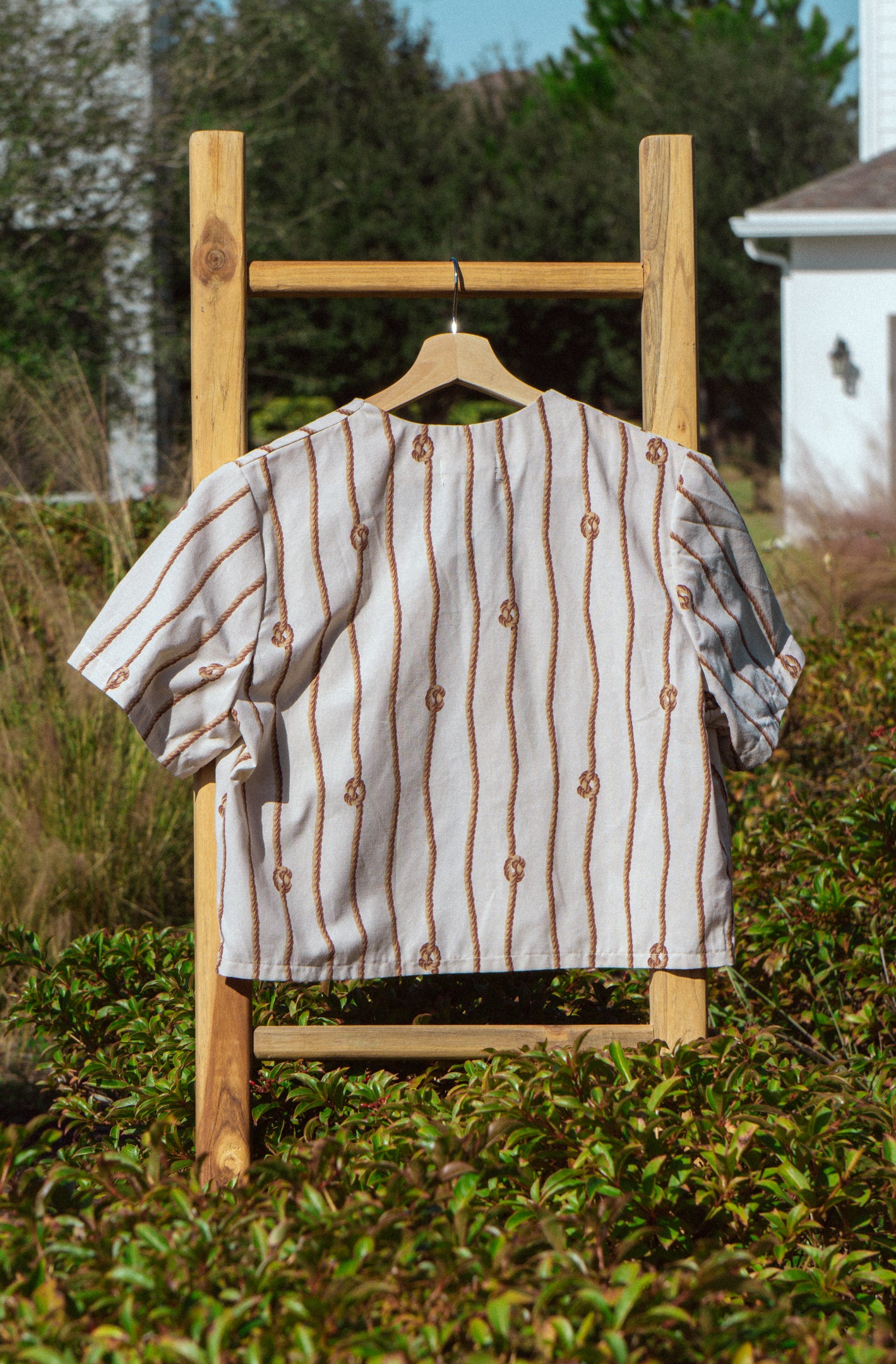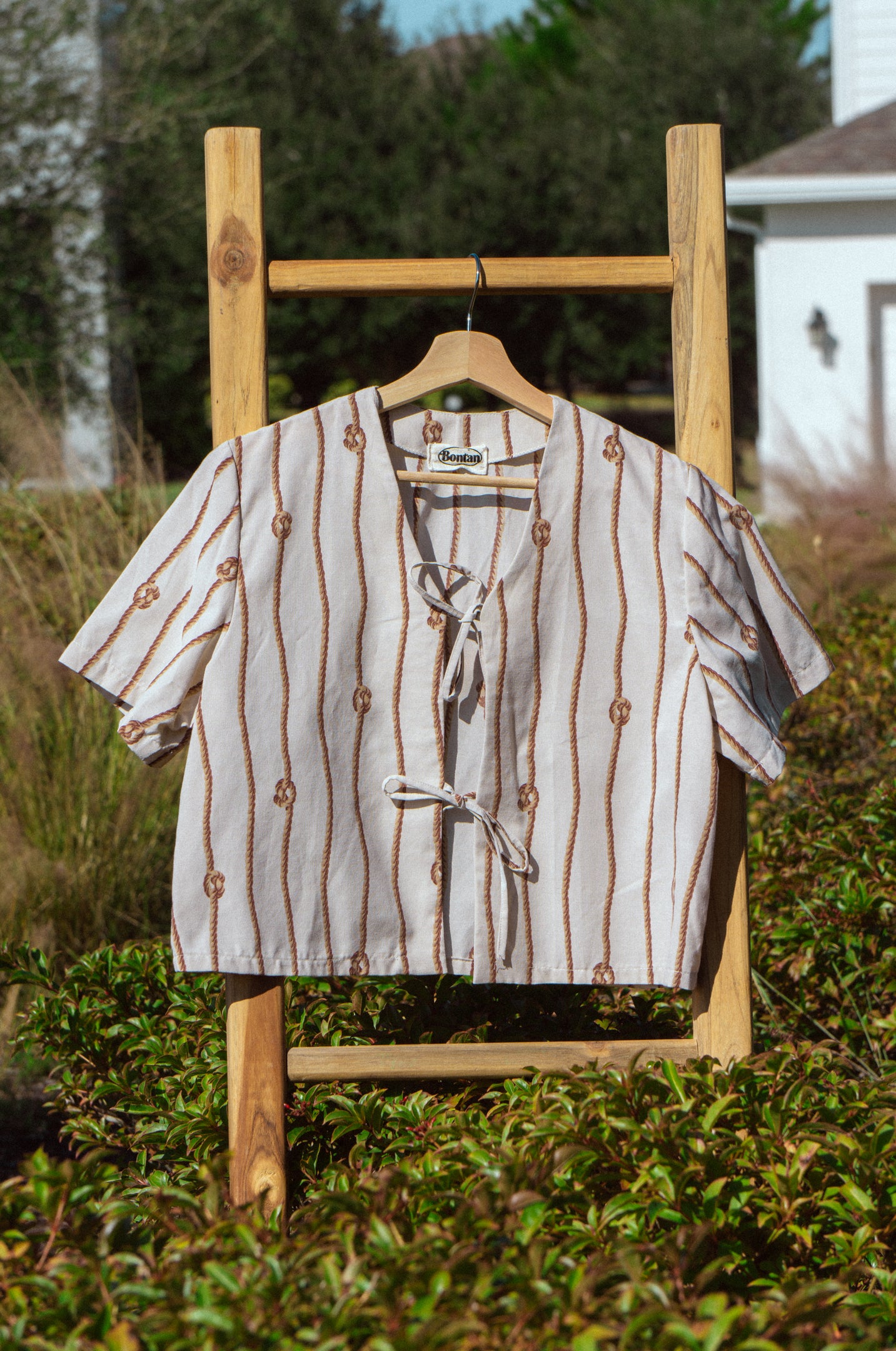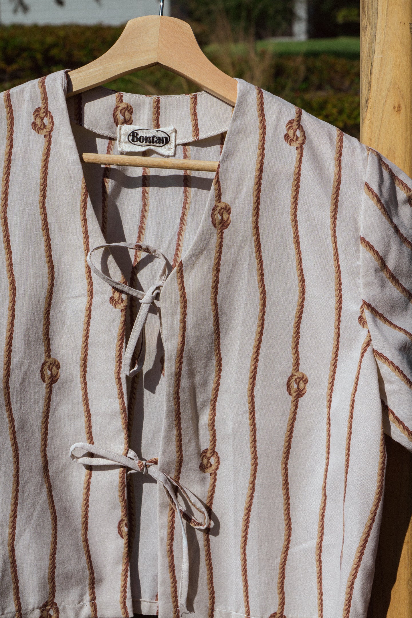 Handmade tie-top made from a vintage bedsheet. Features playful rope stripes across the entire shirt.