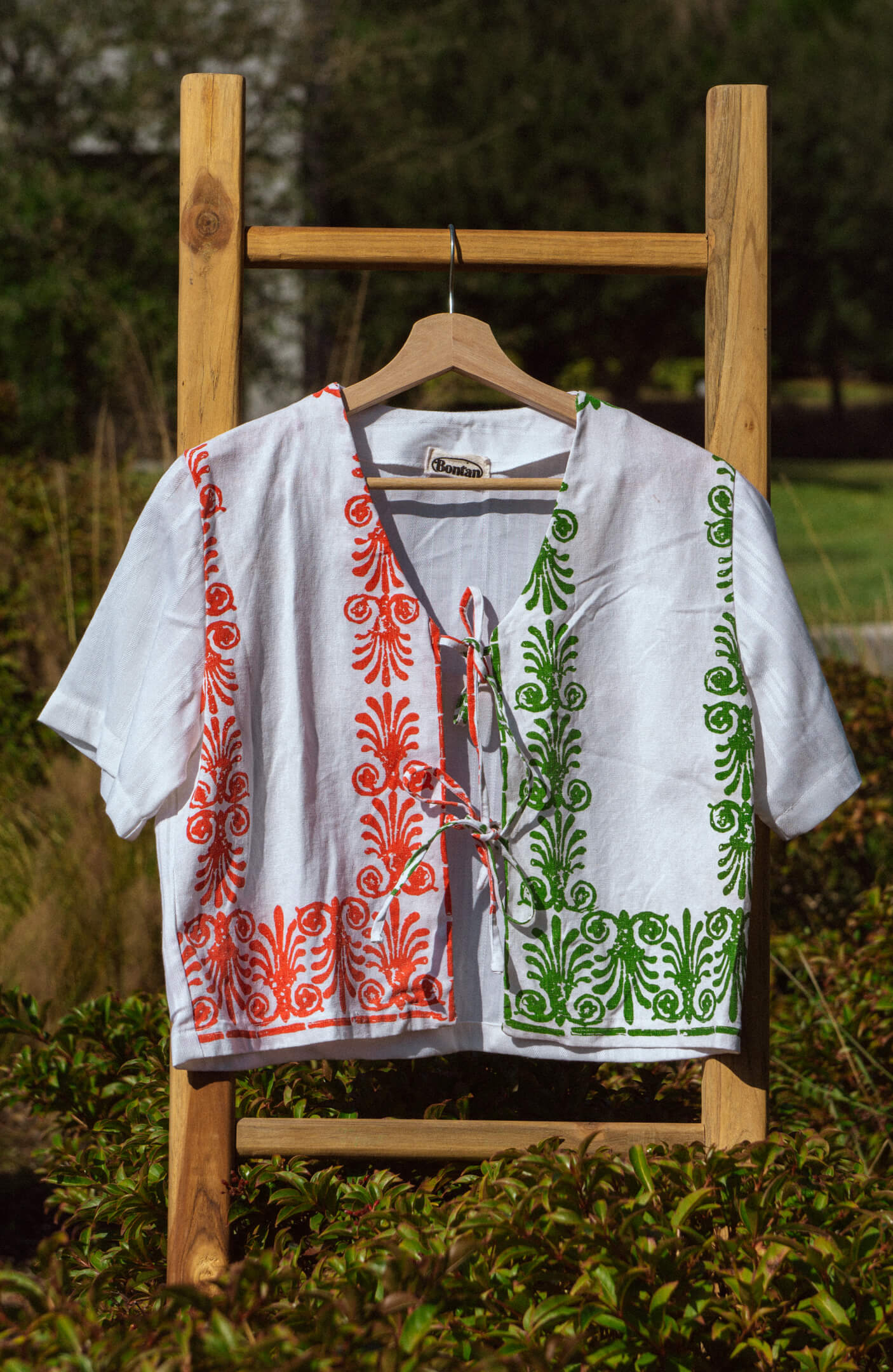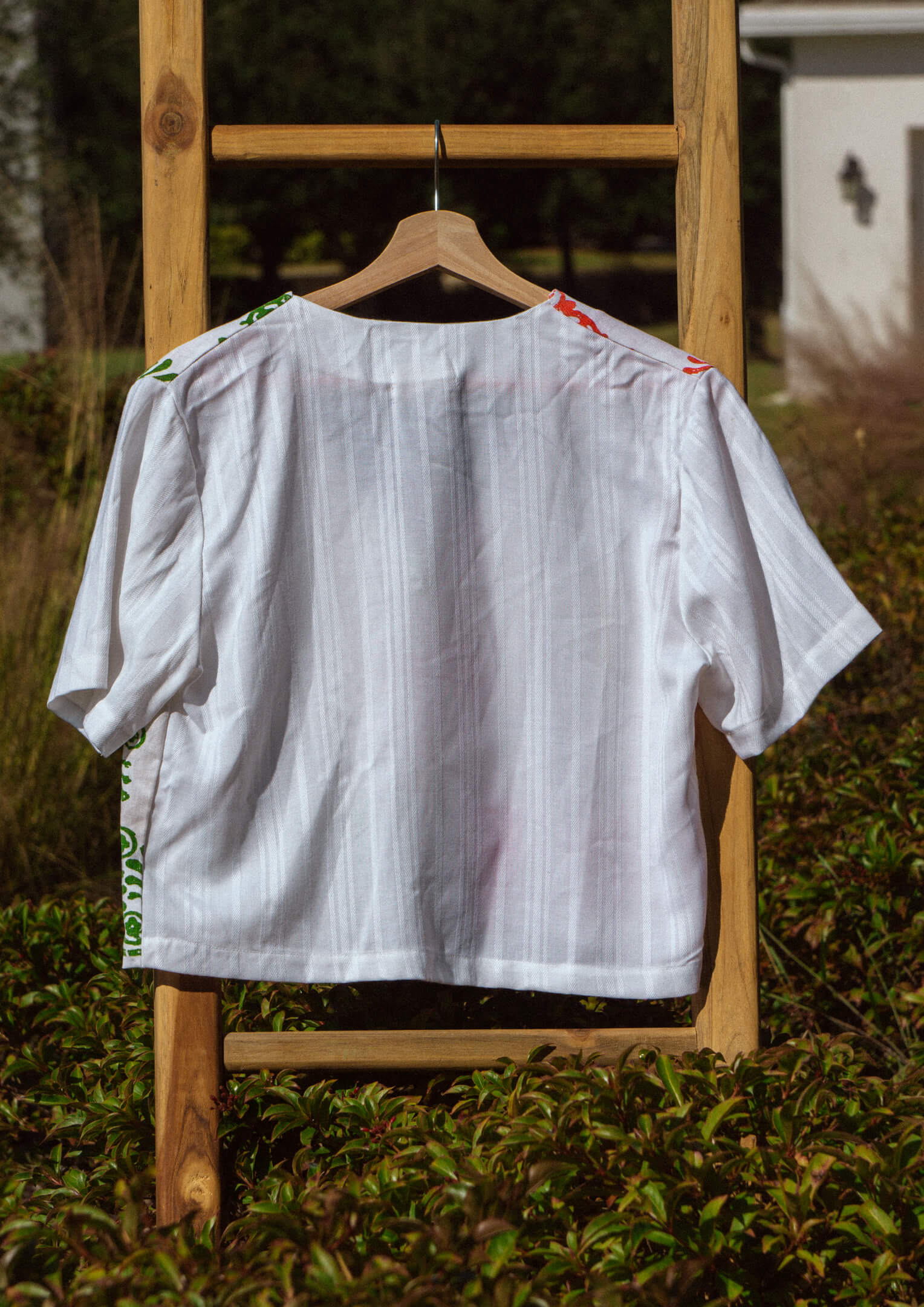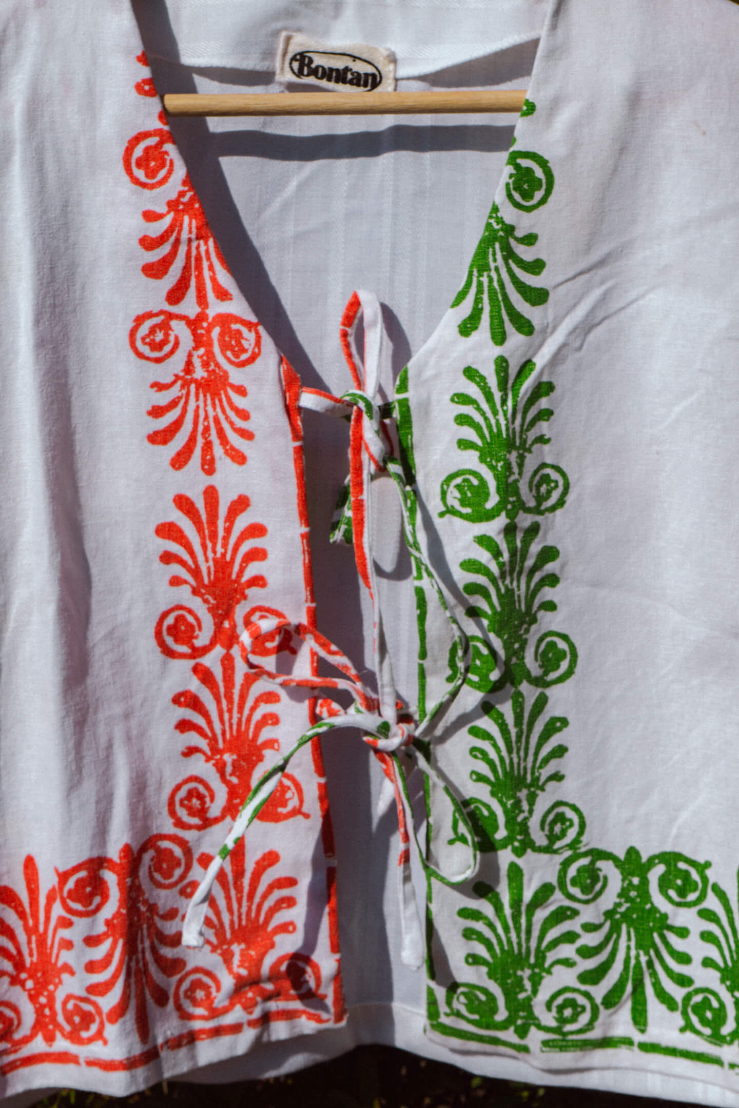 Handmade women's tie-top, made from a matching set of vintage kitchen towels and a vintage tablecloth.